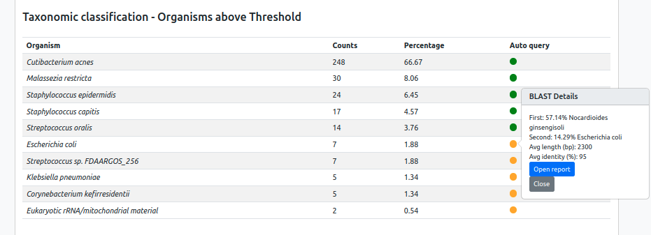 Organism Query has been designed to help guide decision making in cases where the validity of primary taxonomic classification is in doubt, or a taxon is listed in the Reporting SOP as requiring validation. Organism Query is not a gold standard for classification. Please consult with a bioinformatician if the validity of a detection is in doubt, or request appropriate in-vitro reflex tests. Always follow internal governance.