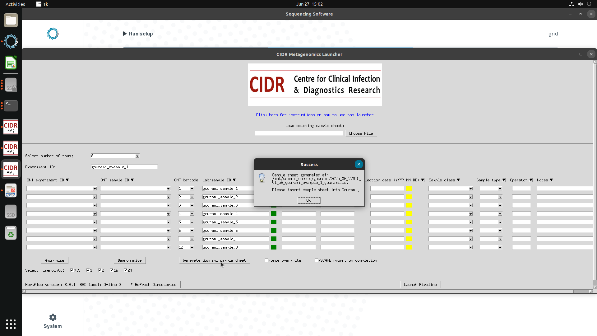- Double click the Metagenomics Launcher icon on the GridION desktop, the CIDR Metagenomics Launcher should appear alongside a terminal window.