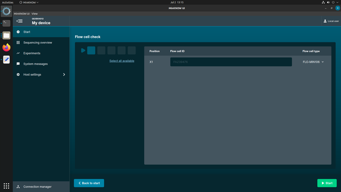- Select 'Flow Cell Check' from the MinKNOW 'Start' screen.