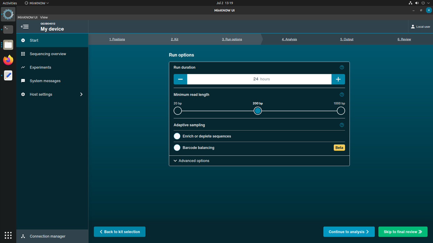 In the run options screen, set the sequencing experiment to last for 24 hours. Leave the read length at 200 bp and select 'Continue to analysis' at the bottom of the window.