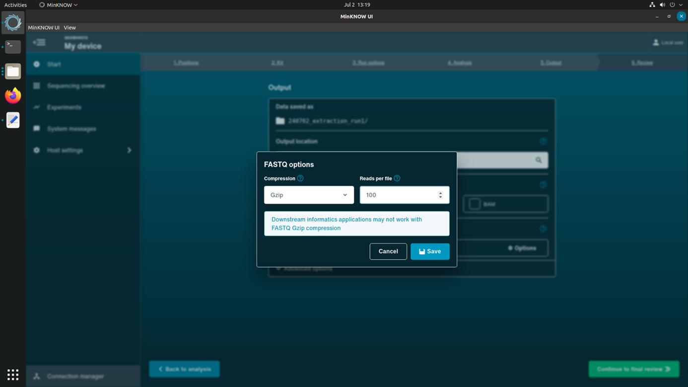 On the Output window, deselect the FAST5 option. Where the FASTQ checkbox is selected, click the gear icon and set 'Reads per file' to 100.