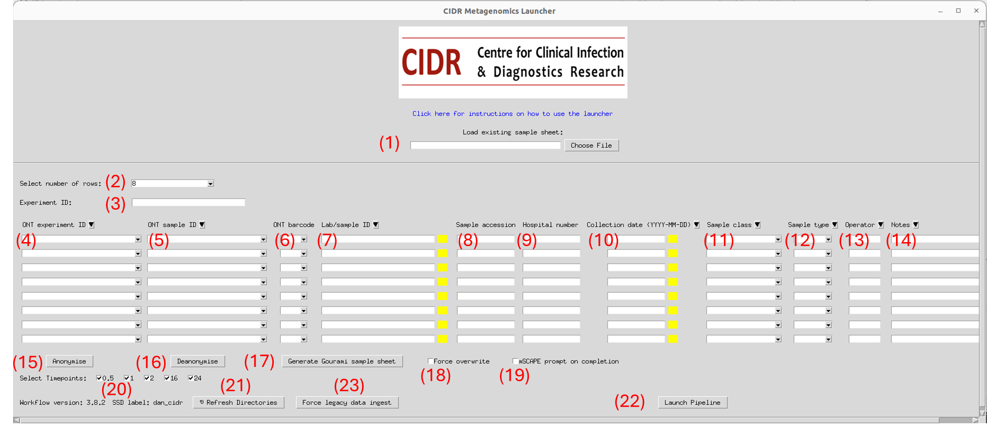 | 21 | Refresh directories | This button refreshes the contents of the MinKNOW experiment ID and MinKNOW sample ID columns. Useful if you have started the launcher before commencing the sequencing experiment. |