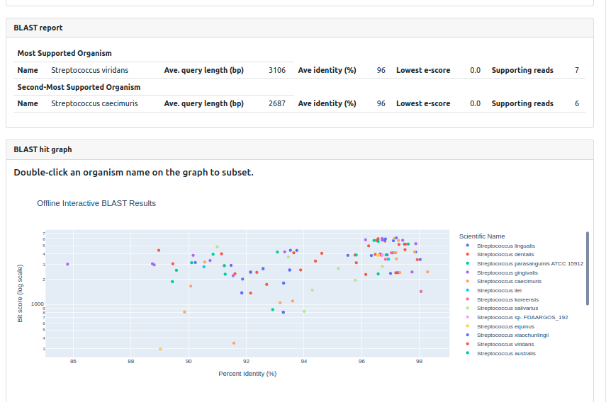 In the image below there is no clustering. Are the alignment subject taxa closely related and is the identity high? Or does the cluster have a largely low % identity with seemingly unrelated disparate taxa? In this example, it is the former. We have alignments with relatively high average identity (>90%) in a single cluster of Streptococcus spp., which are proving difficult to differentiate consistently. It is therefore not appropriate to attempt a species-level call based on this analysis.
