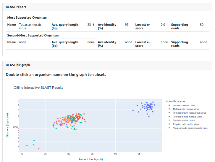 - Is there meaningful convergence illustrated on the BLAST report section or BLAST hit graph? i.e. Are the majority of reads supporting the same taxon? Does the graph show a homogeneous plausible cluster of alignments?