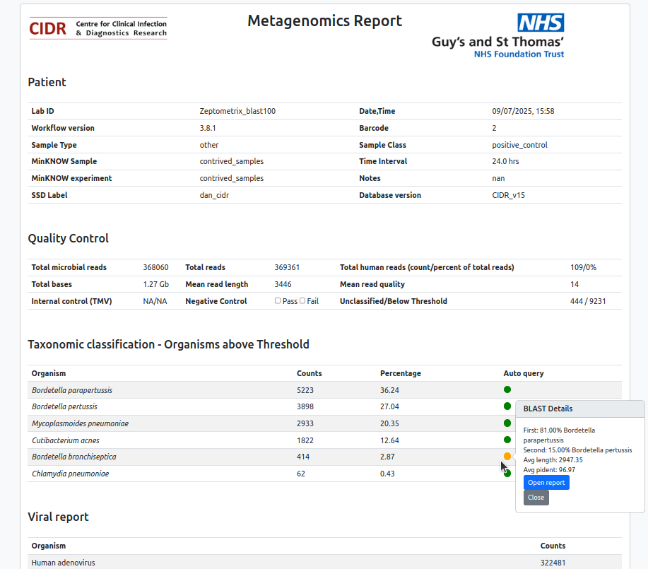 The Organism Query platform is provided to enable further scrutiny of taxonomic classification outputs from the CIDR metagenomics workflow. This tool serves both the Auto Query (traffic light) function on the Metagenomics Workflow outputs and the manual Organism Query interface. It leverages a local (offline) implementation of NCBI BLASTn to analyse a subset of reads from a given detection, summarised in a portable HTML report, with added analyses and logic to consolidate and visualise results.